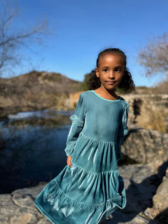 This Eliana Dress in Teal Velvet is the perfect holiday outfit for your little one. Soft, plush velvet in a sparkling teal hue brings festive charm and cozy comfort. Designed for twirling and fun, it keeps celebrations bright and joyful all season long.